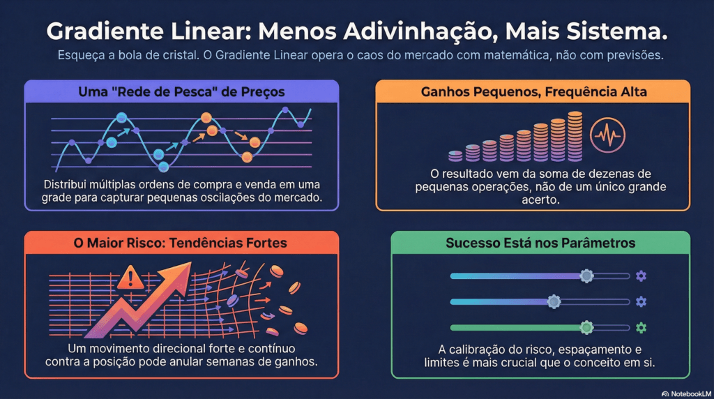 A premissa do Gradiente Linear é direta: o mercado é caótico e imprevisível no curto prazo. Tentar adivinhar a direção é um jogo com esperança matemática negativa.